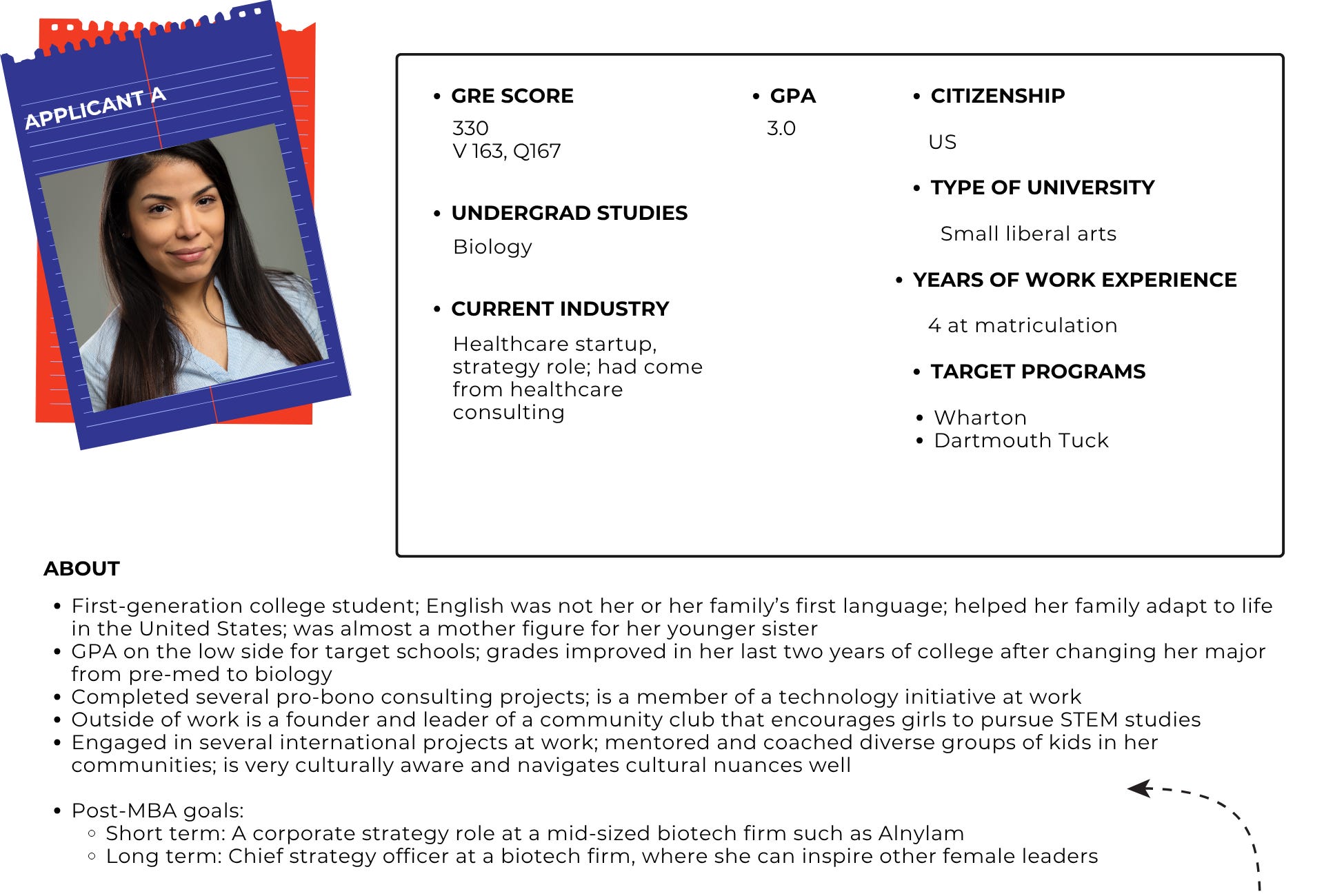While she has relevant experience, she needs more financial acumen and strategy insight as well as knowledge of the biotech and pharma industries to reach her goals. The applicant is interested in Wharton and Dartmouth Tuck for their health-care focus; I also suggest that she consider Northwestern Kellogg, UNC Kenan-Flagler, Duke Fuqua, and Michigan Ross—all of which have strong health-care offerings.