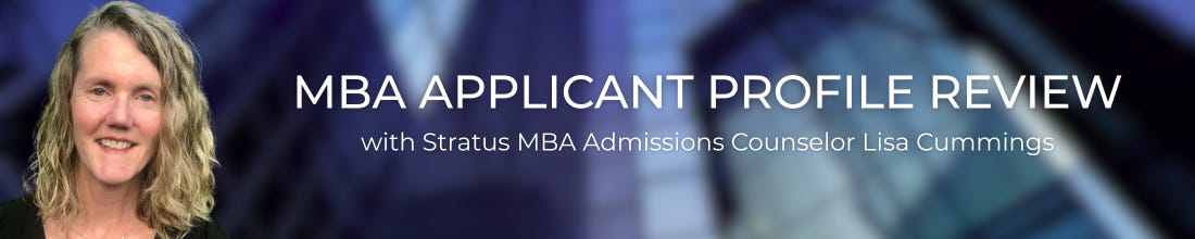 Each week, a Stratus consultant will review an anonymous MBA applicant’s profile and share their expert recommendation, drawing on years of admissions experience.