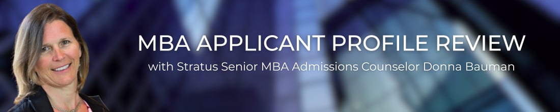 Each week, a Stratus consultant reviews an anonymous MBA applicant’s profile and shares their expert recommendation, drawing on years of admissions experience.